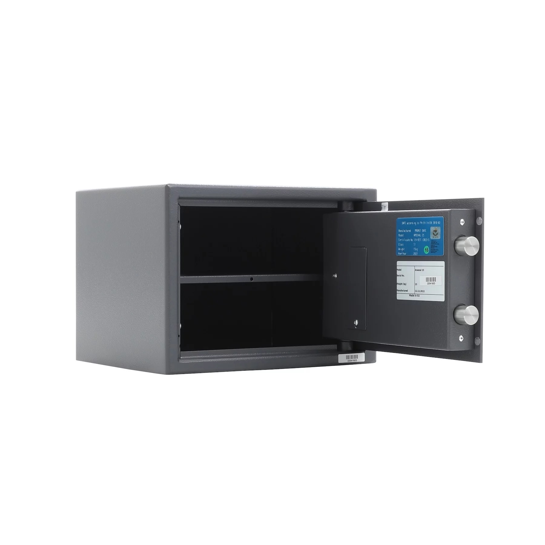 Tabliczka znamionowa potwierdzająca klasę sejfu znajduje się po wewnętrznej stronie drzwi.